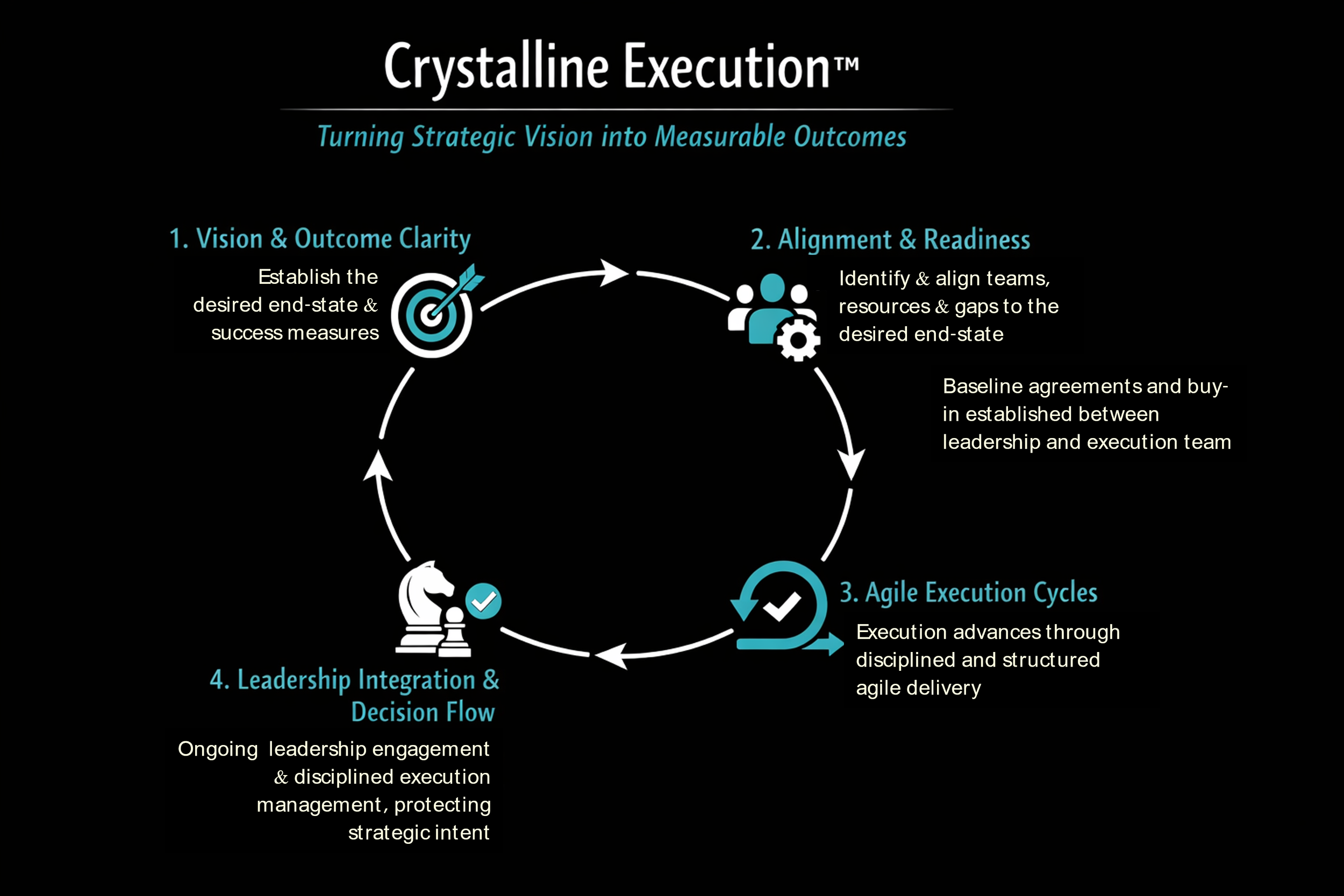 Crystalline Execution blends program management disciplines with agile delivery, guided by transparency and strategic systems to ensure clear execution outcomes.